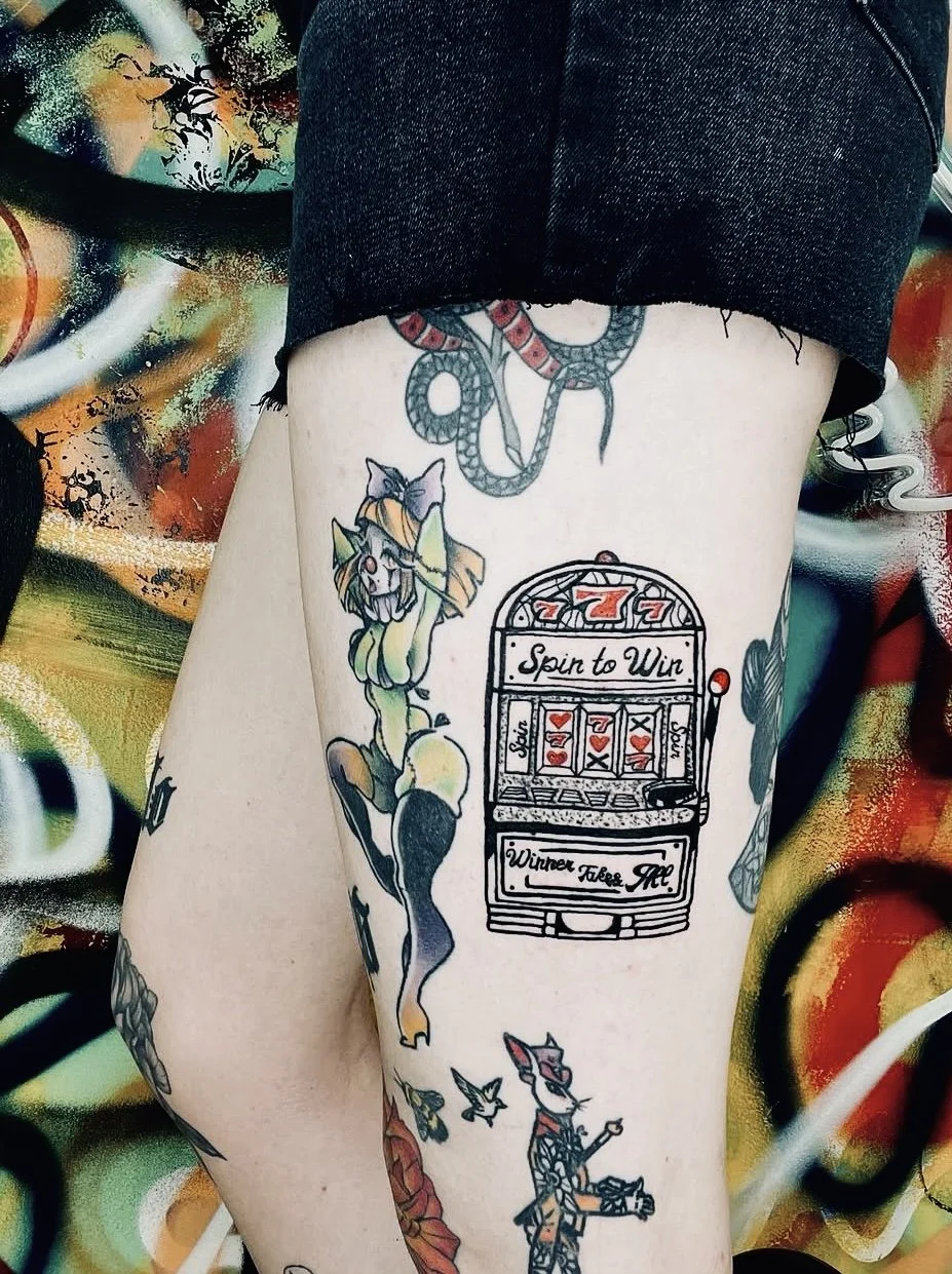 Meet Hope McGee — a vibrant, queer tattoo artist bringing bold color and pop art to life, one tattoo at a time! Originally from Cazenovia, NY, Hope who goes as @psyckoaktive on Instagram, has been tattooing for over 6 years, with experience across Detroit, NYC, Atlanta, and now Las Vegas.